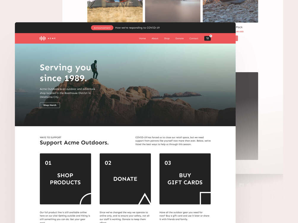 The Biznus template includes a range of pages, including a home page, an about page, a contact page, a donate template, an announcement template, a category template, a product template, a 404 error template, and a style guide page.